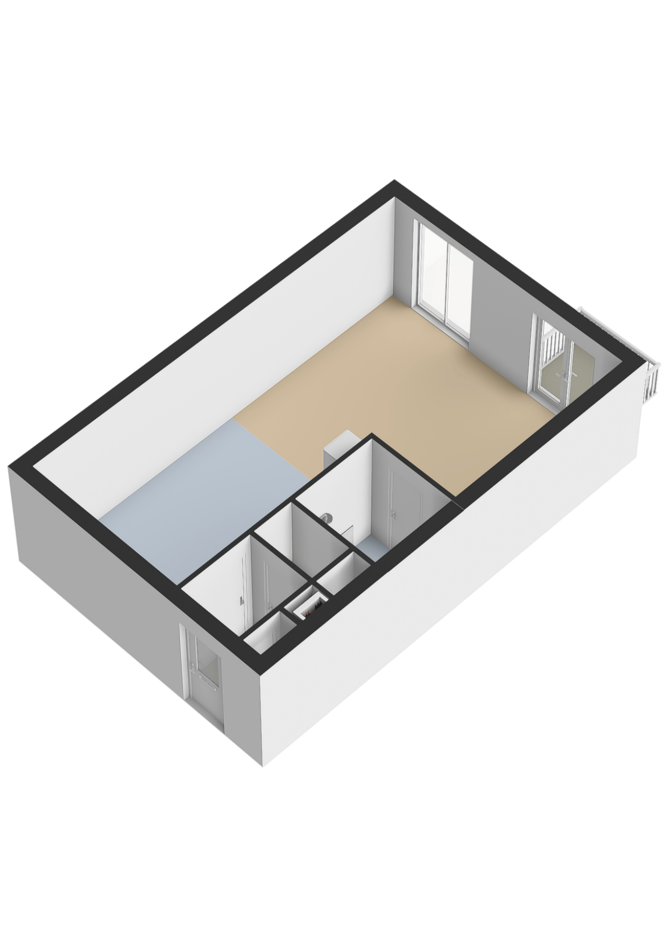 Wil je de studio verder optimaliseren? Dan is het mogelijk om een vaste muur te plaatsen, waarmee je een aparte slaapkamer van circa 10 m² creëert. Dit verandert de woning eenvoudig naar een efficiënt tweekamerappartement, zonder grote bouwkundige ingrepen.